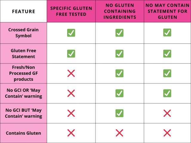 β‘ The Crossed Grain symbol and a Gluten Free Statement mean the same thing; both have to be tested to meet the legal threshold of 20 ppm or less of gluten