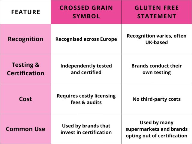 The statement and the Crossed Grain symbol mean the same thing - the product is gluten free to legal standards - and although the symbol is more widely recognised, many brands and supermarkets may choose to use their own gluten free statement to avoid additional costs.